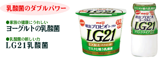 明治乳業と東海大学医学部の研究チームがその新しい作用を発見して話題をよんだLG21乳酸菌は、おなかの健康に役立つ乳酸菌です。 |